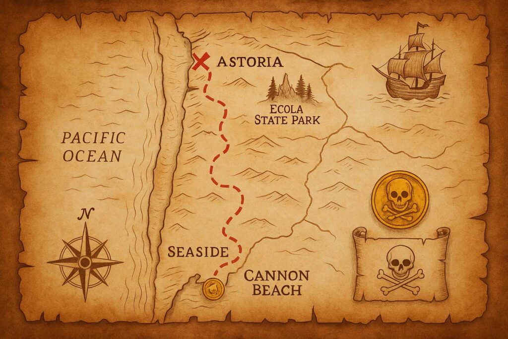Join the ultimate Goonies treasure adventure as you explore the real filming locations in Astoria, Oregon, where the legendary Goonies treasure hunt began. Follow the clues from Seaside Oregon to the famous Goonies map that led to One-Eyed Willy’s hidden pirate gold. Experience a Goonies scavenger hunt like no other and uncover the mystery behind A Whale of A Tale. Discover if the real Goonies treasure still remains buried in Oregon’s coastal legends.